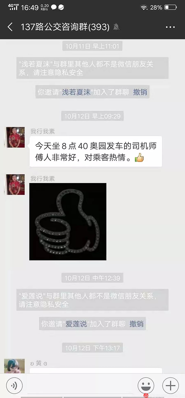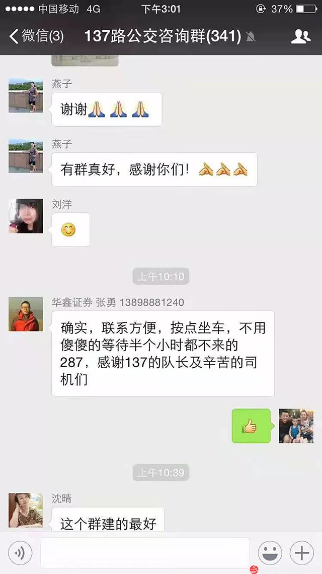 沈蘇公司137路車(chē)隊(duì)于2017年年底創(chuàng)新性的建立了137路車(chē)隊(duì)公交咨詢?nèi)海鸪踝稍內(nèi)褐挥卸怀丝?,三個(gè)月后,137路車(chē)隊(duì)咨詢?nèi)阂呀?jīng)達(dá)到了350人左右。咨詢?nèi)旱慕ⅲ奖懔顺丝团c車(chē)隊(duì)之間的溝通,車(chē)隔時(shí)間的變化車(chē)隊(duì)會(huì)在咨詢?nèi)褐械谝粫r(shí)間發(fā)出通知,使乘客出行更加便捷與高效。