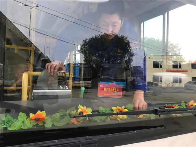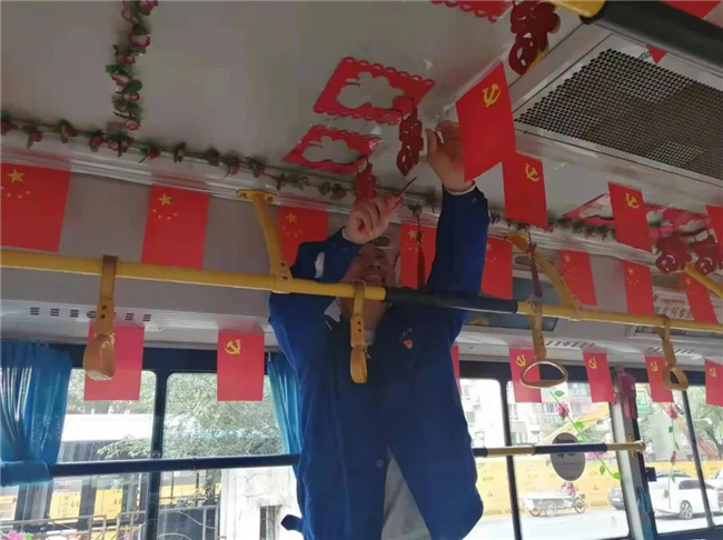 249車隊迎國慶,圖為新黨員駕駛員王眾裝飾“黨員服務(wù)質(zhì)量大提升示范崗”車廂。