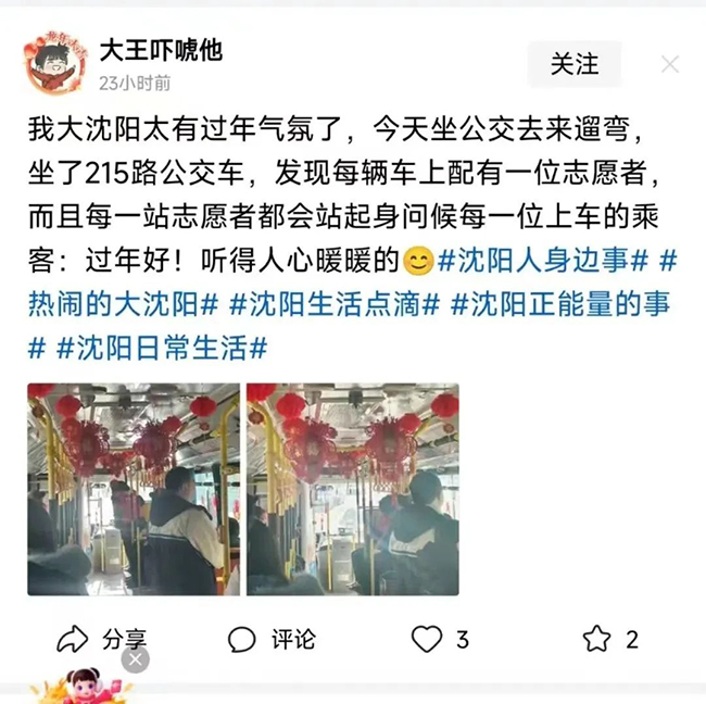 “我大沈陽(yáng)太有過(guò)年氣氛了,今天坐公交車出去遛彎,坐了215路公交車,發(fā)現(xiàn)每輛車上配有一位志愿者,而且每一位志愿者都會(huì)站起身向上車的乘客說(shuō)一聲‘過(guò)年好’,聽(tīng)得人心暖暖的?!边@是網(wǎng)上的一則評(píng)論,作為一名公交人,看到網(wǎng)友對(duì)我們工作的肯定,也讓我們備受鼓舞。