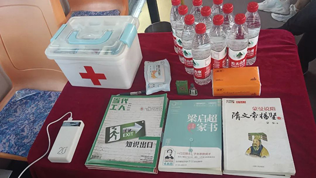 車身懸掛著“以夢(mèng)為馬,不負(fù)韶華,中考砥礪前行”“九年寒窗,在此一搏,沖刺中考,奮斗今朝”等祝福條幅,車廂內(nèi),飲用水、充電寶、文具、應(yīng)急藥物、雨傘、紙巾以及書籍應(yīng)有盡有。不一會(huì)兒,車內(nèi)就坐了不少家長(zhǎng),對(duì)此,家長(zhǎng)們很是感動(dòng),感謝車隊(duì)和王師傅提供的休息場(chǎng)所。