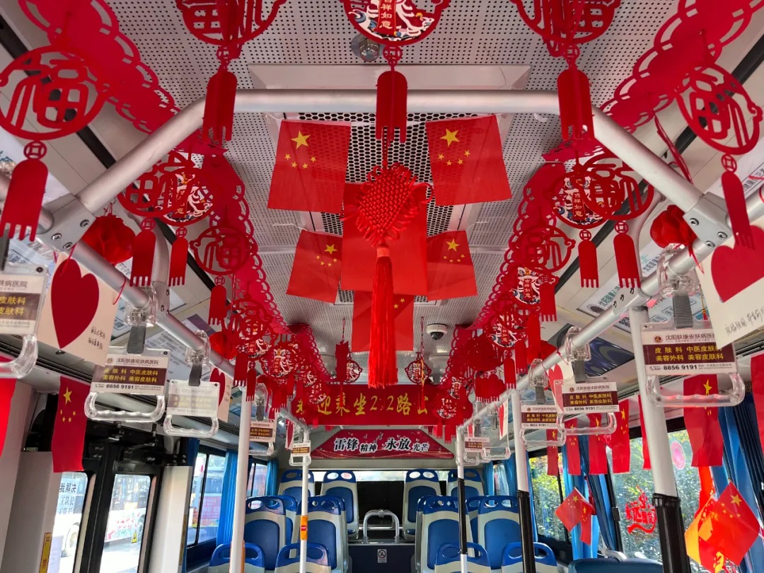 場面三:在沈陽市勞動(dòng)模范、260路駕駛員繆立眾的車廂內(nèi),紅彤彤的國旗懸掛車廂兩側(cè),一句句祝福寄語祖國,讓市民在乘車時(shí)也感受到濃厚的愛國情懷。