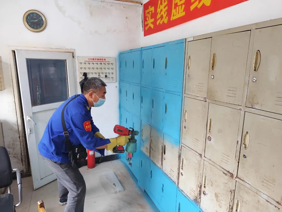 場面五:215路駕駛員陳守春利用自己的休息時(shí)間,帶來噴漆及工具,為大家的更衣柜穿了一件嶄新的“外衣”,美化車隊(duì)環(huán)境的同時(shí),又增添了濃郁的節(jié)日氣氛。
