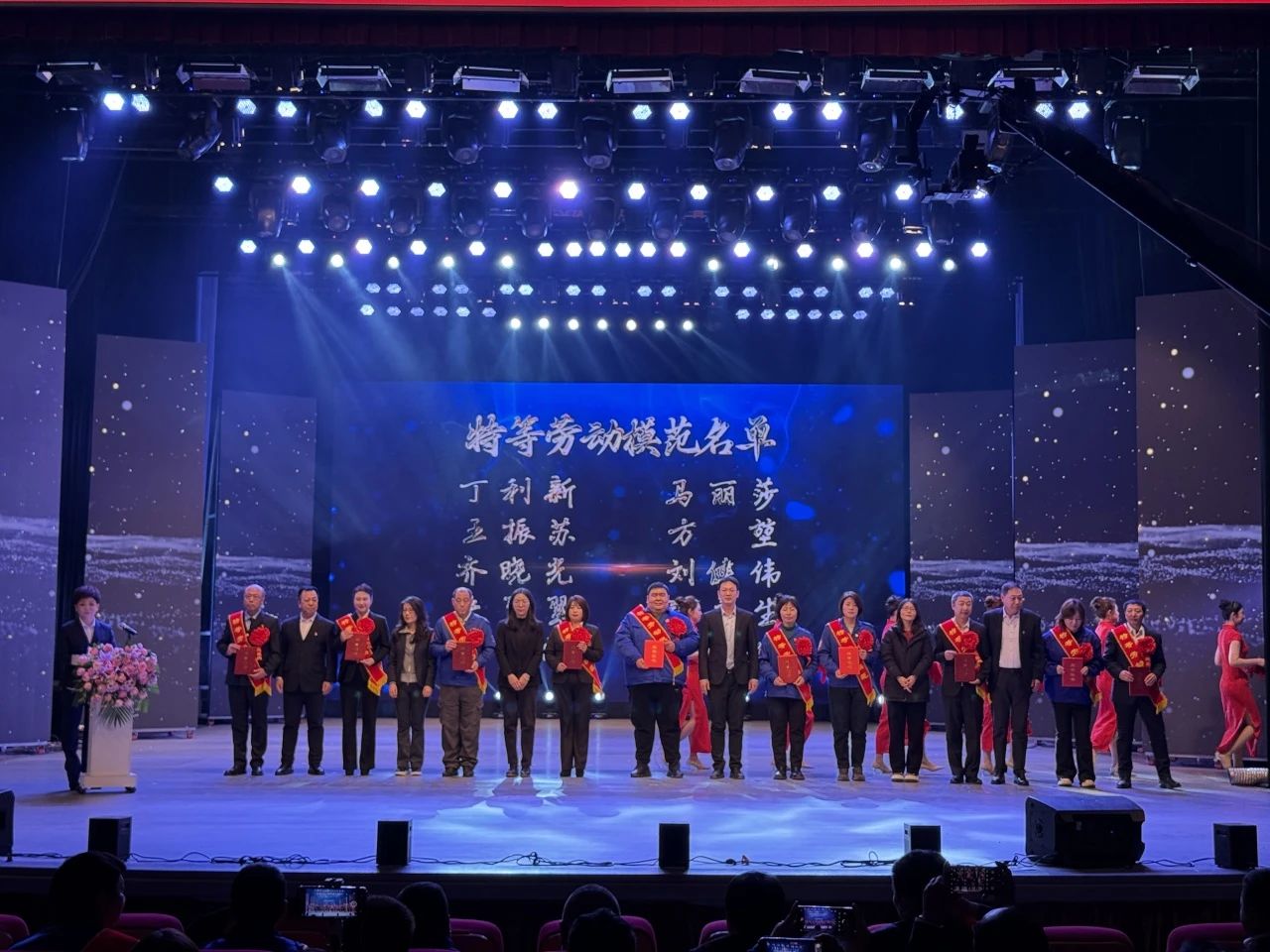 勞動(dòng)模范代表上臺(tái)領(lǐng)獎(jiǎng)