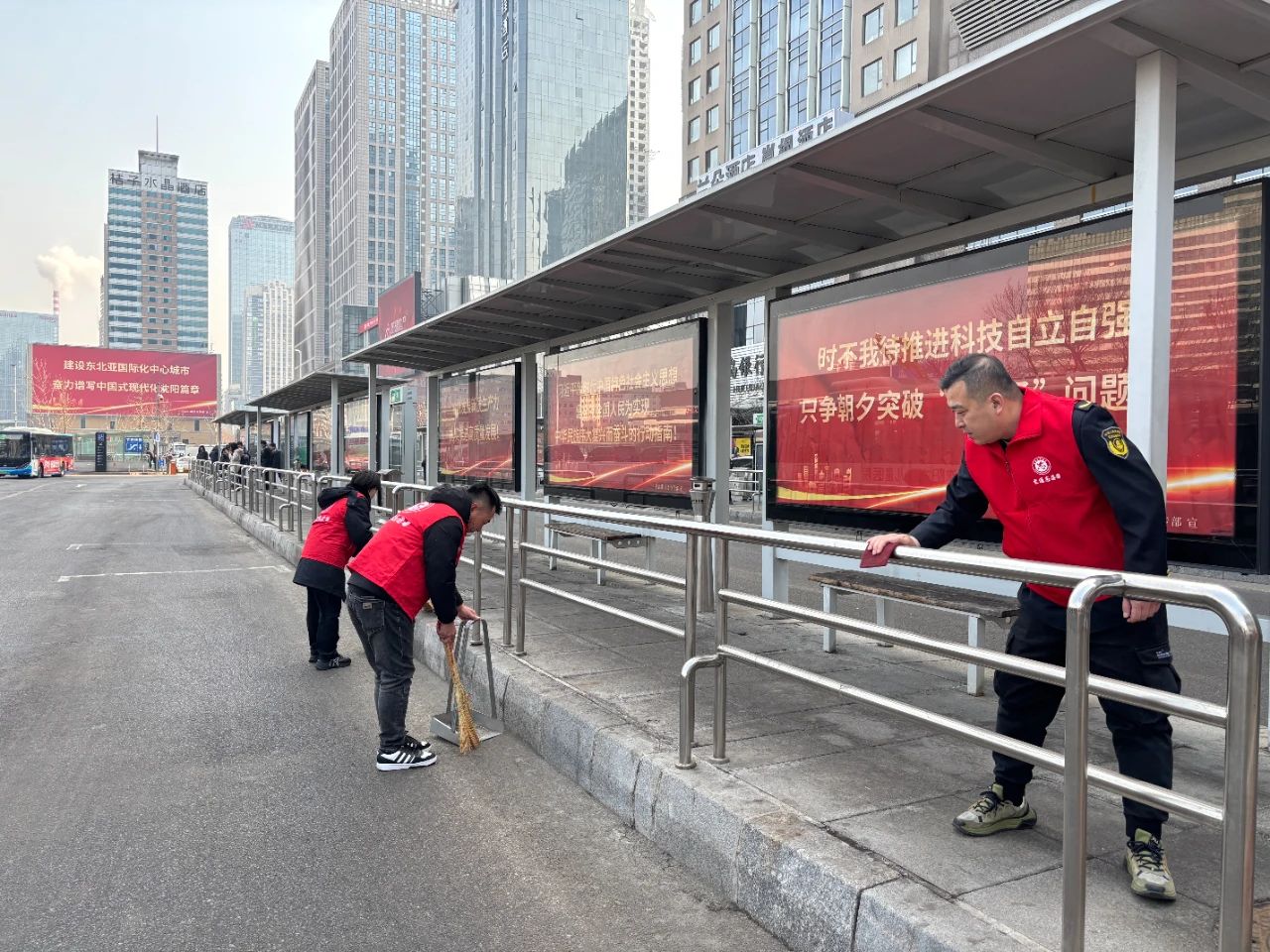 在北站公交樞紐站,志愿者們認(rèn)真清掃公交樞紐站內(nèi)的垃圾、擦拭公交候車?yán)纫约芭抨?duì)護(hù)欄,不放過任何一個衛(wèi)生死角,為乘客們營造了一個整潔舒適的候車環(huán)境。