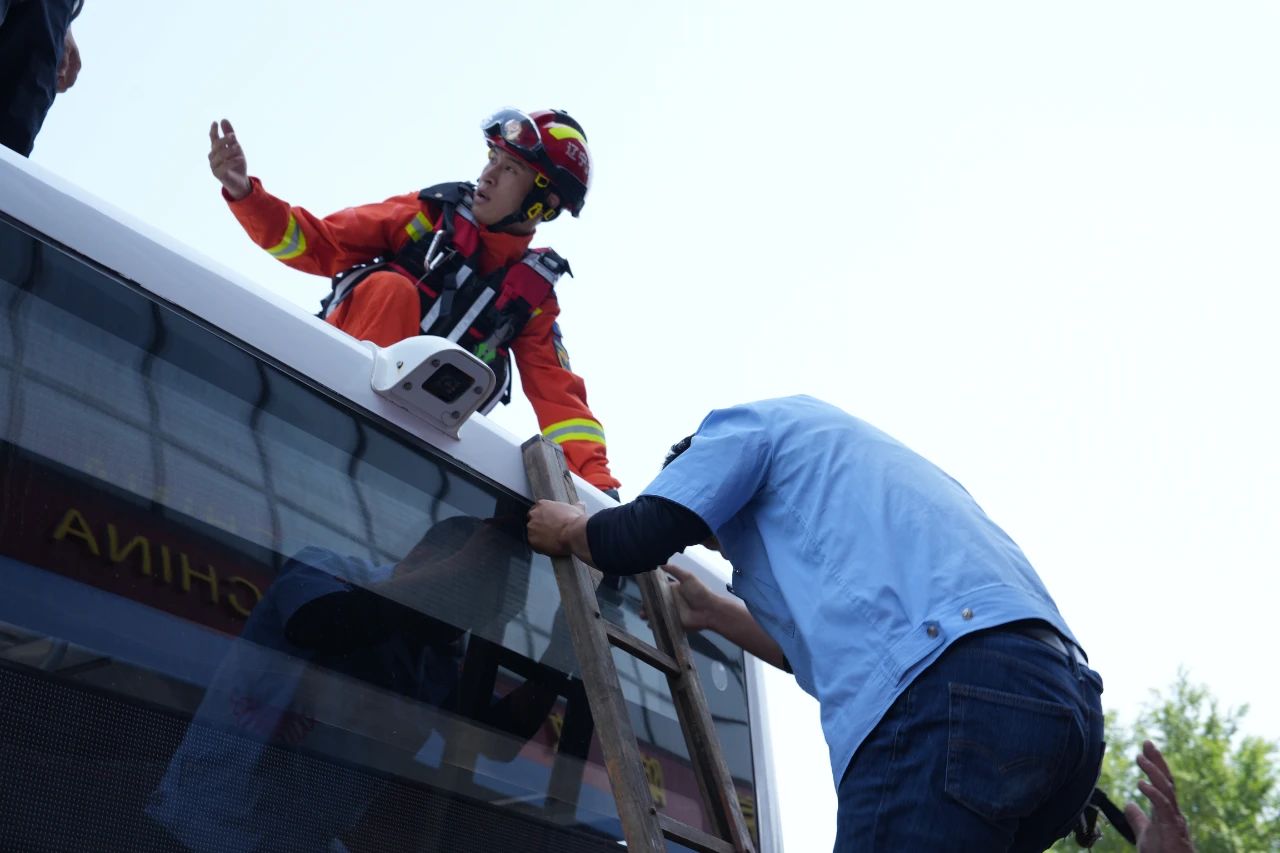 緊隨火情處置,演練模擬強(qiáng)降雨導(dǎo)致路段嚴(yán)重積水,一輛公交車(chē)被困深水區(qū)。駕駛員迅速組織乘客轉(zhuǎn)移至車(chē)廂高位避險(xiǎn),并向公司調(diào)度中心求助。調(diào)度中心通過(guò)智能監(jiān)控系統(tǒng)實(shí)時(shí)鎖定車(chē)輛位置,協(xié)調(diào)消防救援力量。救援人員攜帶梯子、水上救生艇等專(zhuān)業(yè)裝備迅速抵達(dá)。采用繩索牽引技術(shù)建立安全通道,有序轉(zhuǎn)移乘客,并對(duì)特殊群體實(shí)施“一對(duì)一”精準(zhǔn)救助,15分鐘內(nèi)完成全部被困人員安全轉(zhuǎn)移。