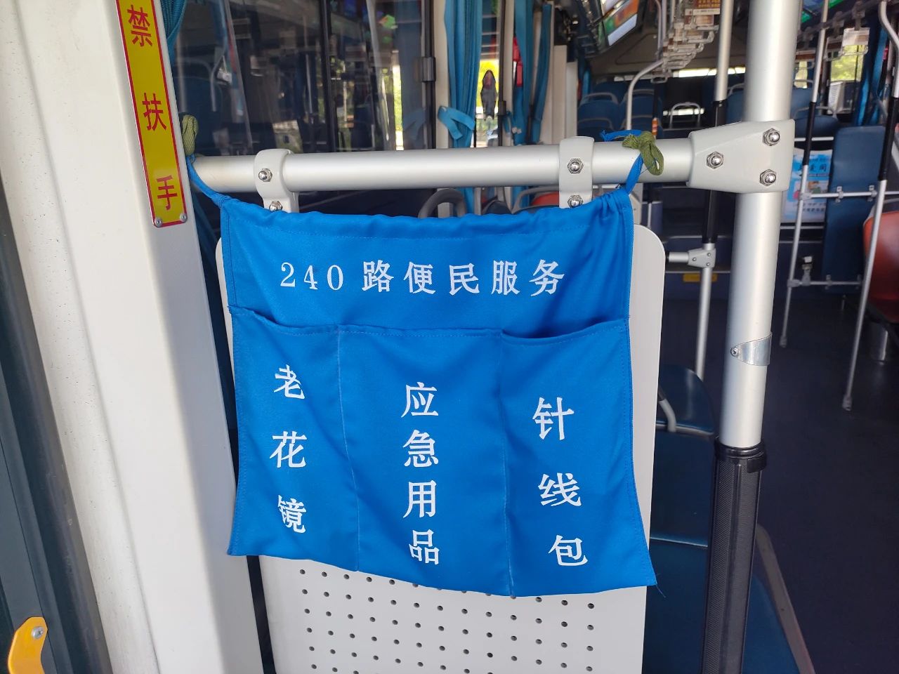 在240路的乘客中,老年乘客占比約55%,為提供更貼心、細心的服務(wù),車廂內(nèi)配備了一系列便民設(shè)施:急救藥品、口罩、老花鏡、針線以備不時之需;無障礙設(shè)施方便特殊乘客;愛心座椅專為老人、孕婦、兒童等群體設(shè)置;“愛心雨傘”保障雨天出行無憂。這些設(shè)施充分體現(xiàn)了以乘客為中心的服務(wù)理念。