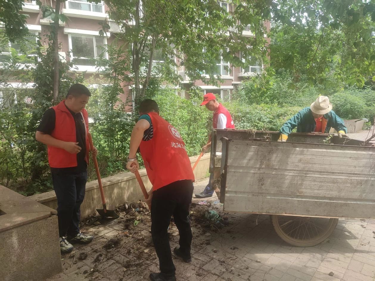 除草現(xiàn)場,黨旗高揚,分工有序。老黨員手持鐵鍬,對零星高草精準“點殺”;年輕黨員配合默契,高效推進;社區(qū)黨員與物業(yè)人員緊隨其后,將碎草裝車清運。泥土沾滿褲腳,汗水浸透衣背,卻無一人停歇。經(jīng)兩小時奮戰(zhàn),300余平方米草坪恢復平整,新翻泥土清香撲鼻。