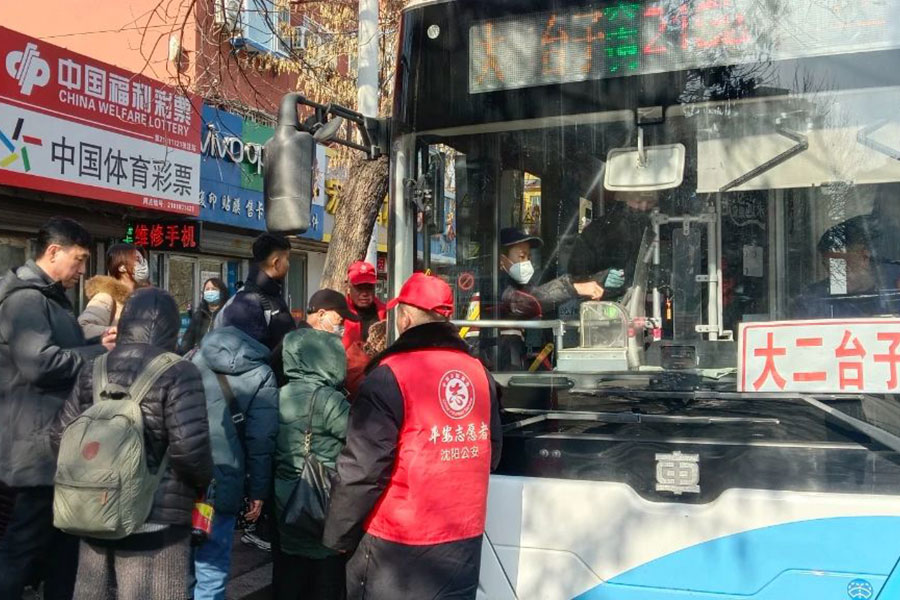 在219路大二臺(tái)子公交站臺(tái),一位拄拐老人正在志愿者的攙扶下平穩(wěn)登車;寒風(fēng)中,身穿紅馬甲的工作人員細(xì)心擦拭著候車長(zhǎng)椅;車廂里,...