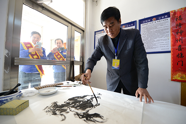 文藝演出后,書畫藝術(shù)家們與集團公司勞動模范、星級駕駛員在通利公司一樓大廳進行了書畫藝術(shù)交流,現(xiàn)場展示了藝術(shù)家書法、繪畫創(chuàng)作全過程,讓駕駛員們親身感受書畫創(chuàng)作的藝術(shù)魅力。