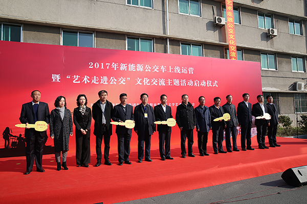 此次啟動儀式由集團公司黨委書記劉文清同志主持,集團公司副總經(jīng)理周宇航同志介紹了2017年新能源公交車上線運營情況,和平區(qū)文聯(lián)韓笑冰主席代表參加此次活動的42位藝術(shù)家向此次活動致辭,市交通局副局長劉玉林同志和市總工會農(nóng)林城建工會主席李福志同志向沈陽客運集團公司所屬的黃河公司、通利公司、沈蘇公司、沈鑫公司和天益公司配發(fā)新能源公交車鑰匙,劉玉林同志宣布了2017年新能源公交車上線運營暨“藝術(shù)走進公交”文化交流主題活動正式啟動。