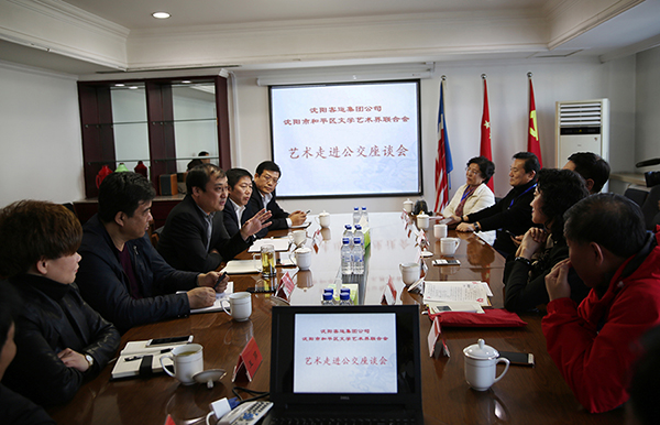下午,藝術(shù)家們來到沈陽客運集團公司辦公大樓,與集團公司領(lǐng)導(dǎo)進行座談。會上,集團公司領(lǐng)導(dǎo)班子對藝術(shù)家們的到來表示熱烈歡迎,總經(jīng)理徐健對藝術(shù)家們給公交送來藝術(shù)并開創(chuàng)全國首家藝術(shù)公交線路這種形式給予贊賞;文聯(lián)主席裴達樹、副主席韓笑冰代表和平區(qū)文聯(lián)表達了對此次活動的愿望與祝福。藝術(shù)走進公交,就是為公交車插上藝術(shù)的翅膀,讓公交車成為流動的藝術(shù)館,通過公交車這個載體,讓廣大市民認識藝術(shù),了解藝術(shù),傳承藝術(shù),使藝術(shù)公交成為沈城一條靚麗的風(fēng)景線。