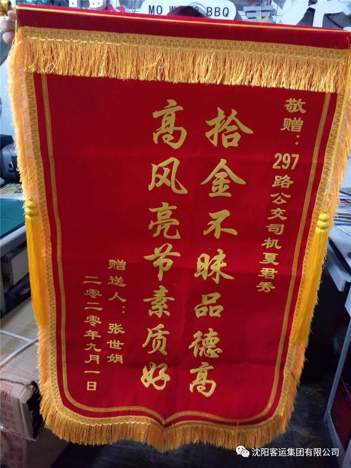 過了一會,張女士來到了站務室,她回憶到自己乘坐297路公交車,下車的時候發(fā)現(xiàn)手機不見了,于是她求助路人給自己的手機撥打電話,最后得知手機掉落在剛乘坐的公交車上并被駕駛員撿到,張女士對高健隊長和駕駛員夏君秀表示萬分感謝,第二天早晨還送來了錦旗表達自己的謝意。