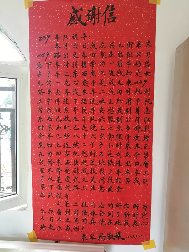 這是公交車駕駛員日常工作中再平凡不過的一件小事,但是對86歲的老奶奶及家人來講格外的暖心?!斑@是我母親親自手寫的感謝信,她讓我務(wù)必親自送到你們手中…”老奶奶女兒激動(dòng)的說。