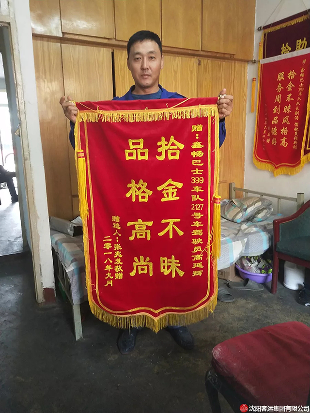 399路0016號單車駕駛員高延輝,在打掃車廂衛(wèi)生的時候發(fā)現(xiàn)了老人的包,并第一時間交給了隊長。經(jīng)查看包內(nèi)現(xiàn)金1500余元、一部蘋果手機及各種證件。經(jīng)過近三個小時的努力尋找,最終聯(lián)系到了失主,接到車隊打來的電話的張老失哽咽的說不出話來。當天下午張老就為車隊送來了錦旗:品格高尚,拾金不昧。
