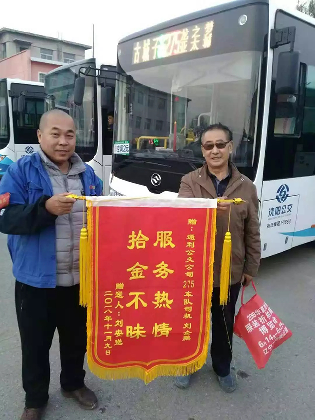 乘客劉先生隨后也到了龍之夢(mèng)拿到了失而復(fù)得的巨額票據(jù),卻沒能見到駕駛員劉金鵬。幾日后乘客劉先生來(lái)到了龍之夢(mèng)終點(diǎn)站為駕駛員劉金鵬送上了一面錦旗,稱贊275路車隊(duì)駕駛員拾金不昧,高尚品德,心系乘客…